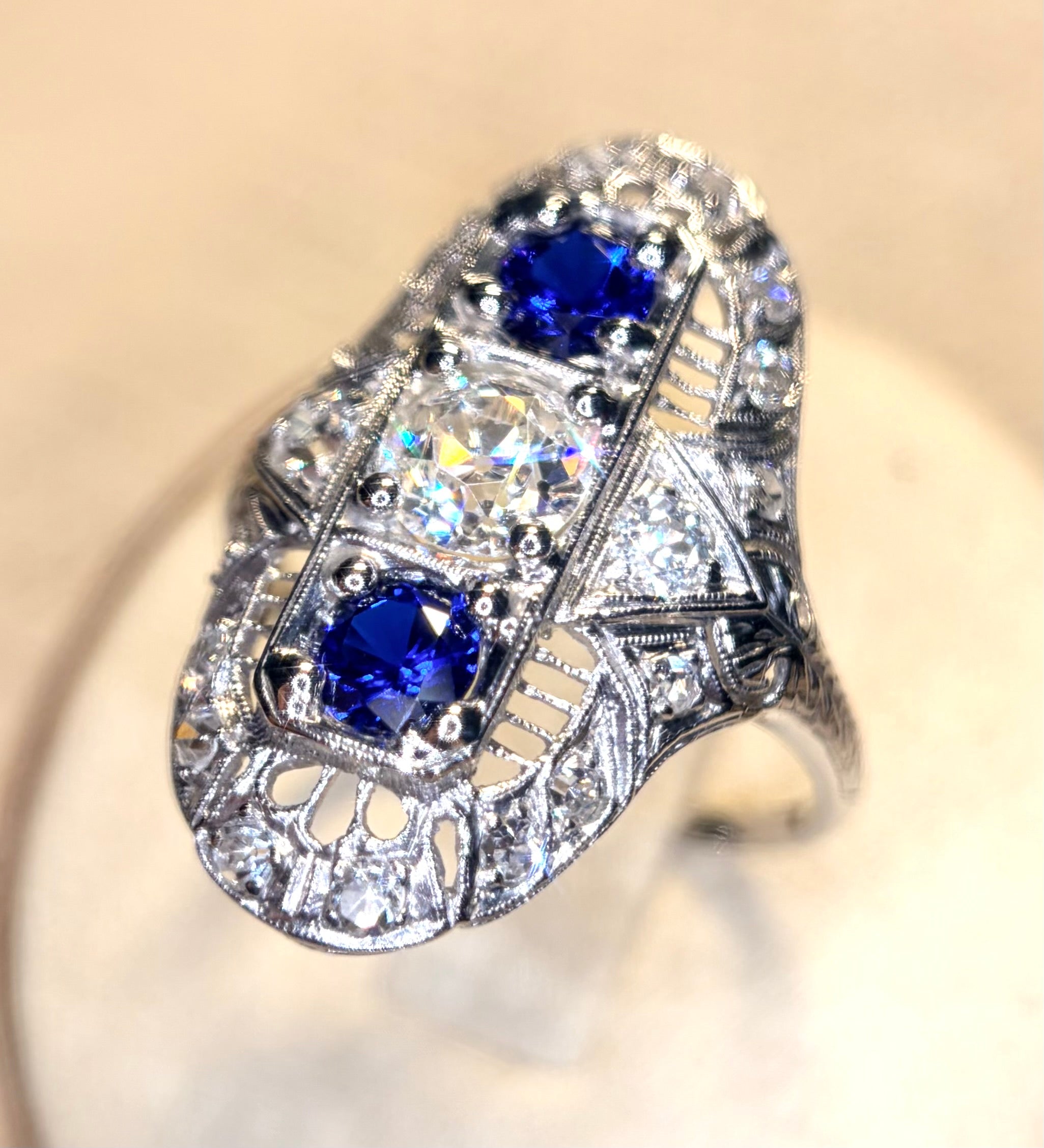 Art Deco Platinum Sapphire & Old Cut Diamond Shield Ring