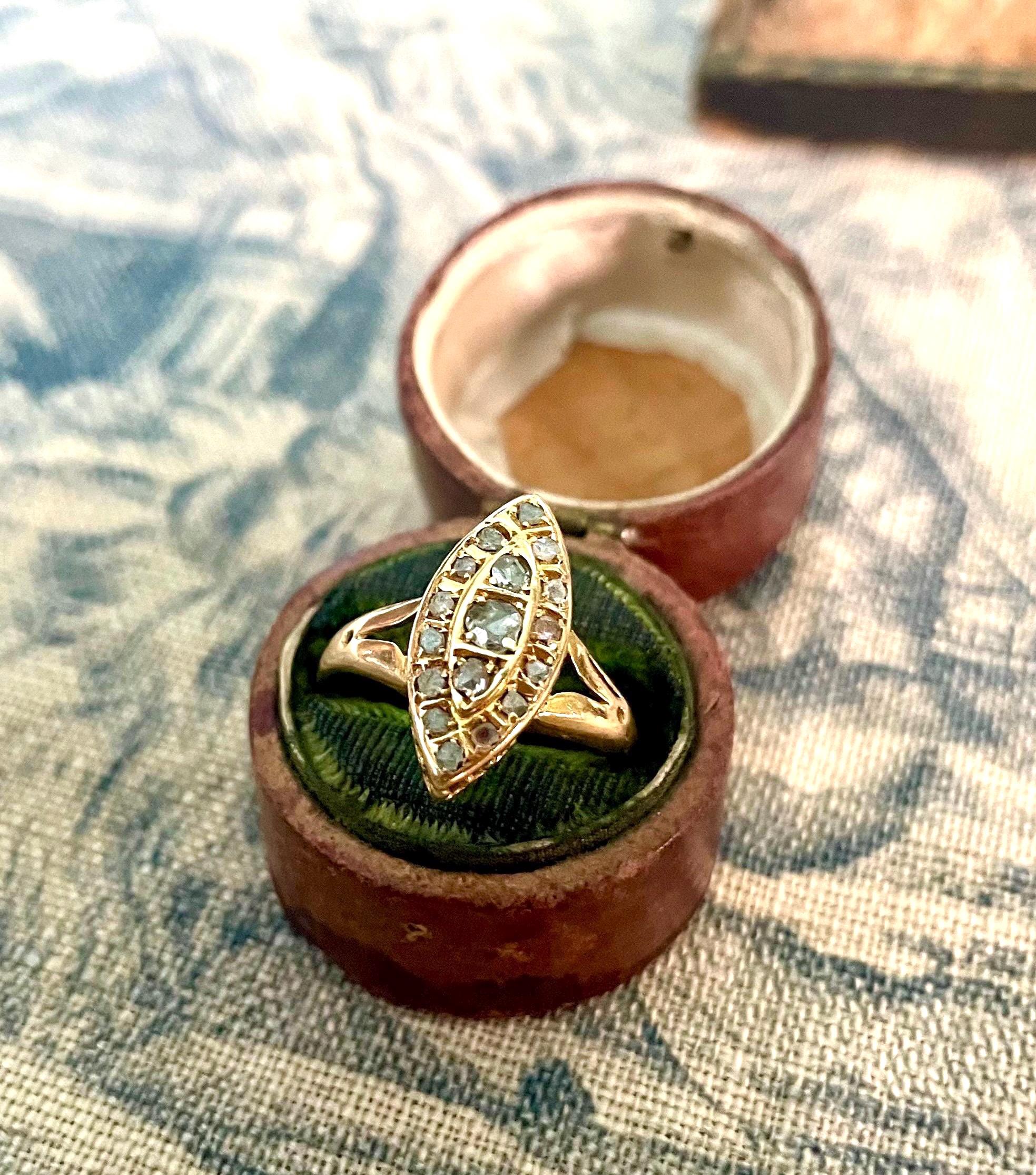 La Dama Gris ~ Anillo de vestir tipo navette antiguo de oro y diamantes talla rosa de la época victoriana
