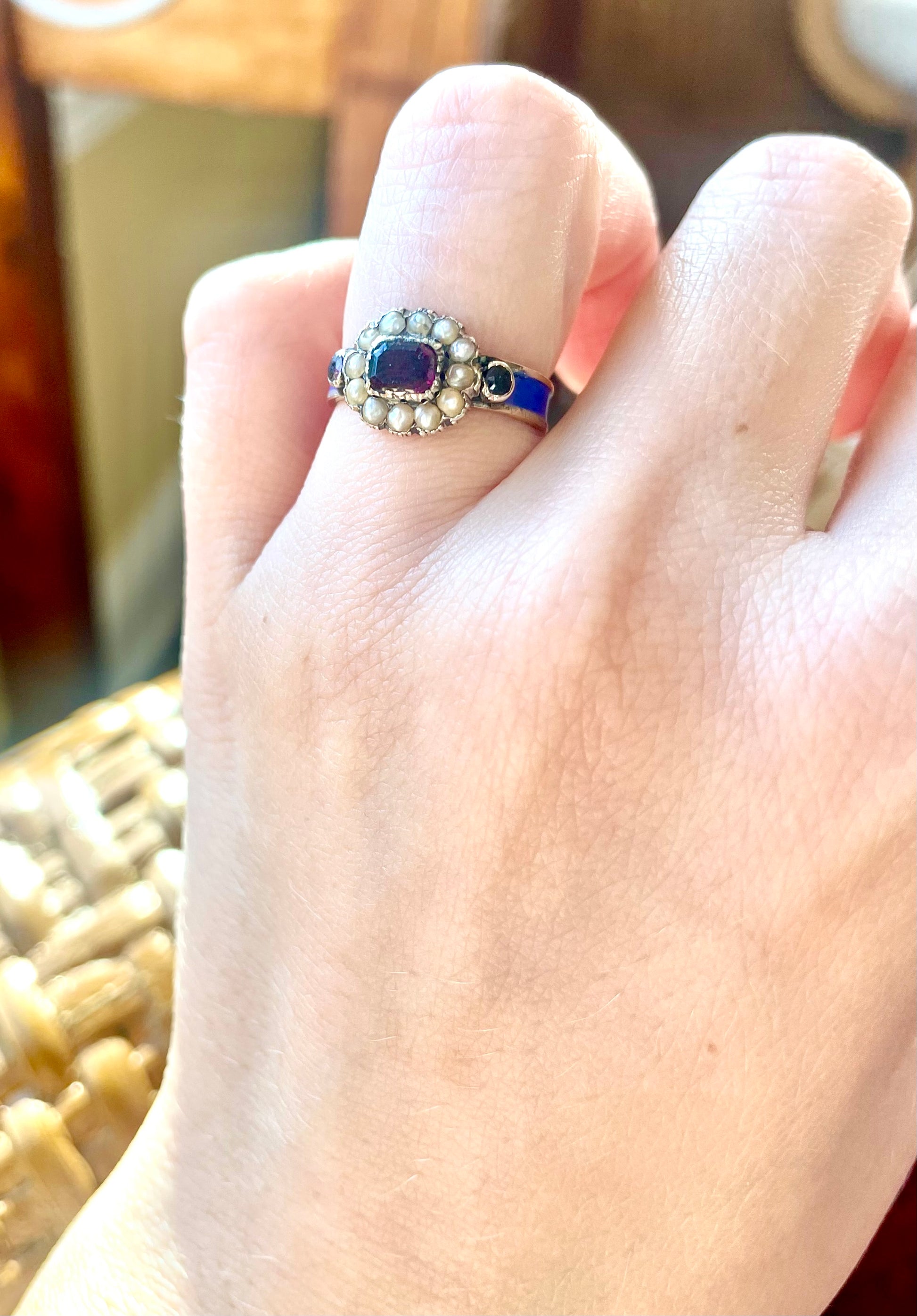 Georgian Blue Enamel & Purple Garnet Seed Pearl Ring