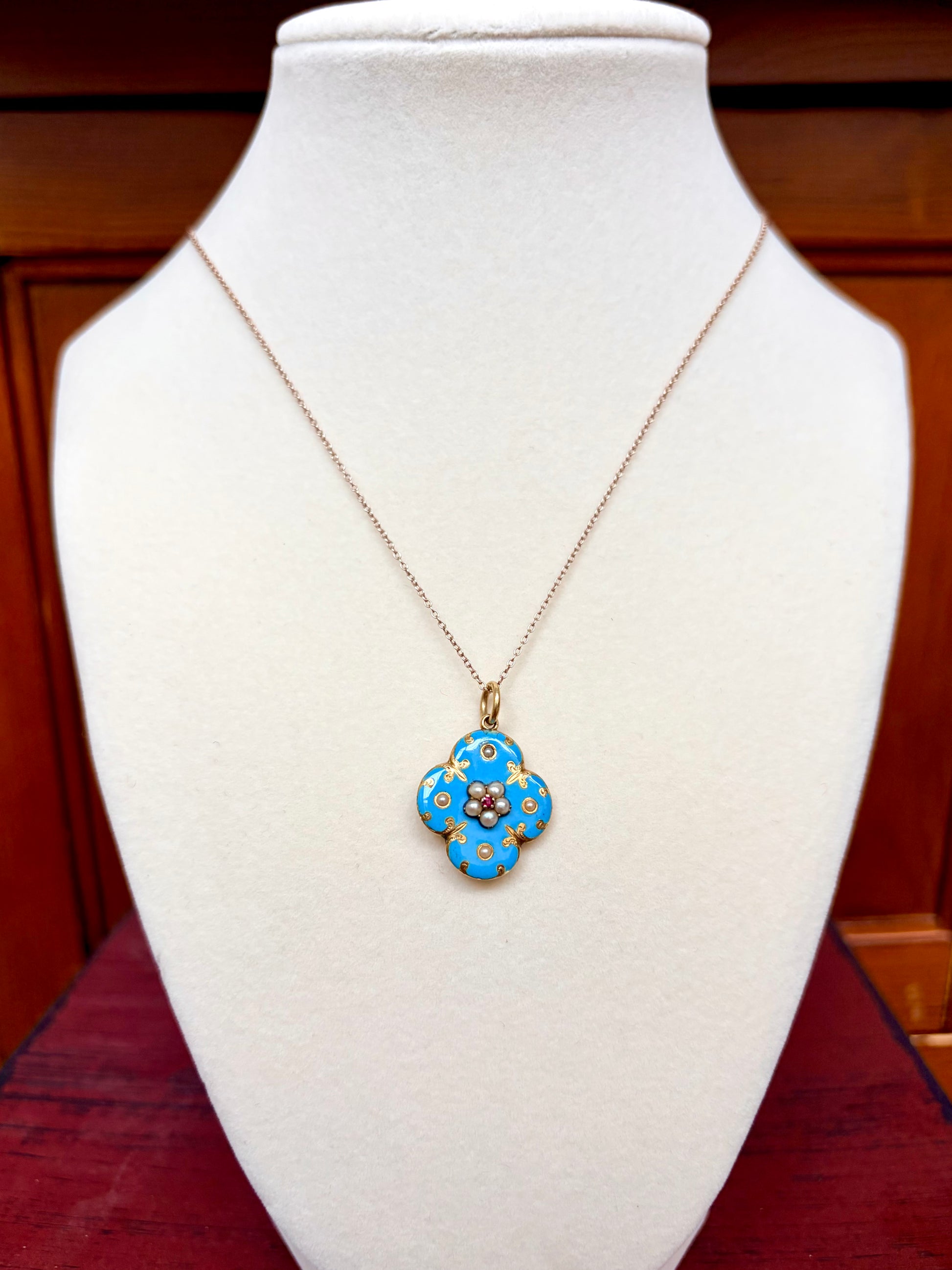 A very lovely Victorian 18 carat gold locket with tiny seed pearls, a tiny ruby, little fleur-de-lis motifs, and the brightest robin’s-egg-blue enamel you ever did see. This locket is in wonderful condition, with only a tiny bit of enamel wear at the very top of the locket, and some minor scratches and dents on the back and underside of the locket, keeping with normal wear commensurate for its age.