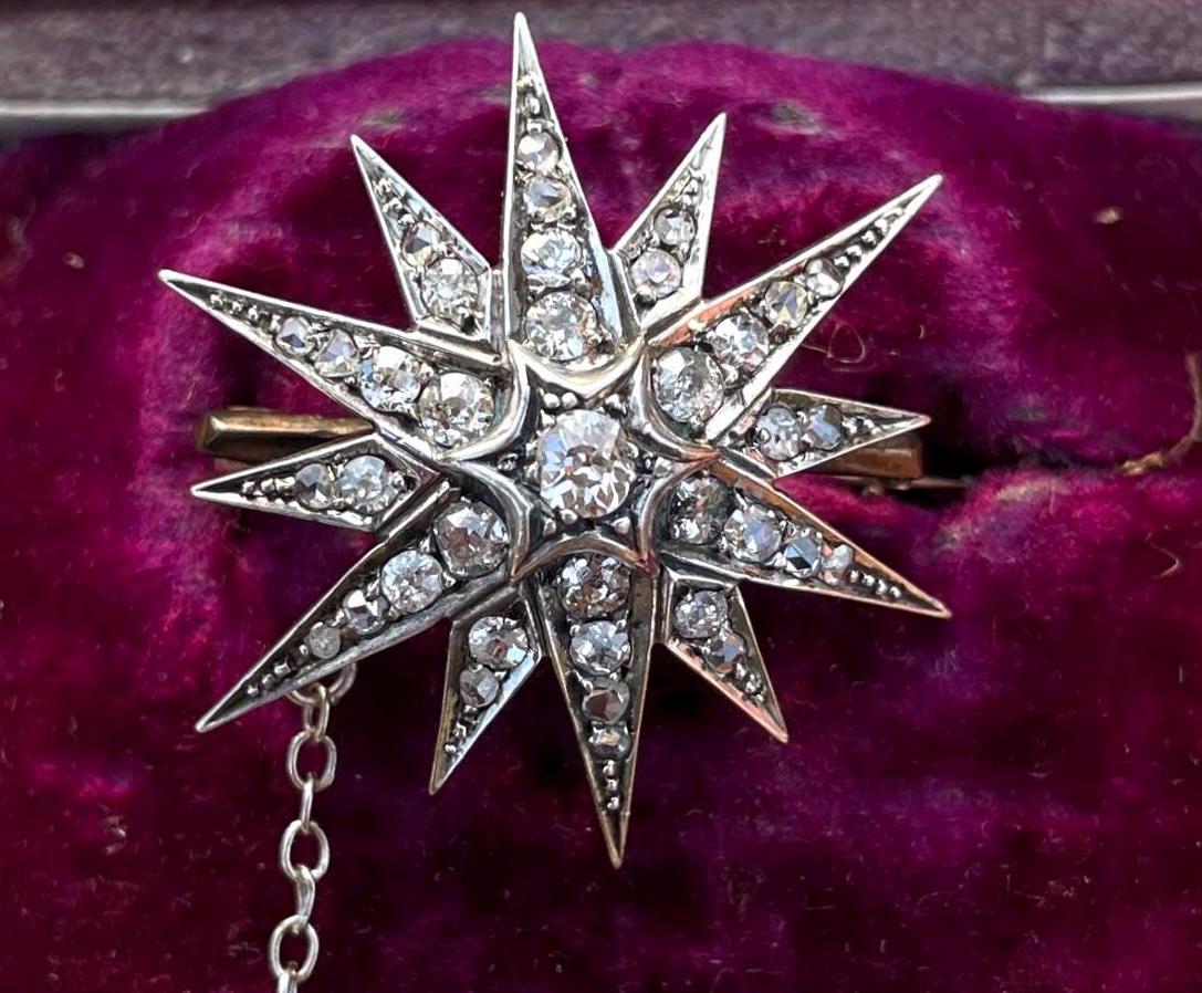 L'Astraea ~ Broche/Pendentif en forme d'étoile de soleil en or et diamants, style victorien antique, d'une grande finesse.