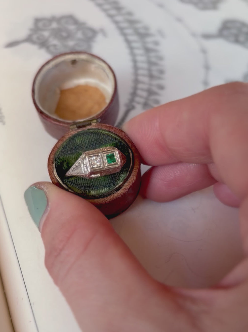 A beautiful “Toi et Moi,” or “You and Me” ring dating to the Art Deco period, this ring is made in a nice solid 18 carat white gold with the geometric patterns characteristic of the Art Deco era, along with some vegetal motifs also included on the setting and shank, perhaps a combination of or a last breath of the Art Nouveau. In the center lies a bright, sparkling diamond, along with clean, glowing, blue-green emerald, neither bigger than the other, both equal partners.