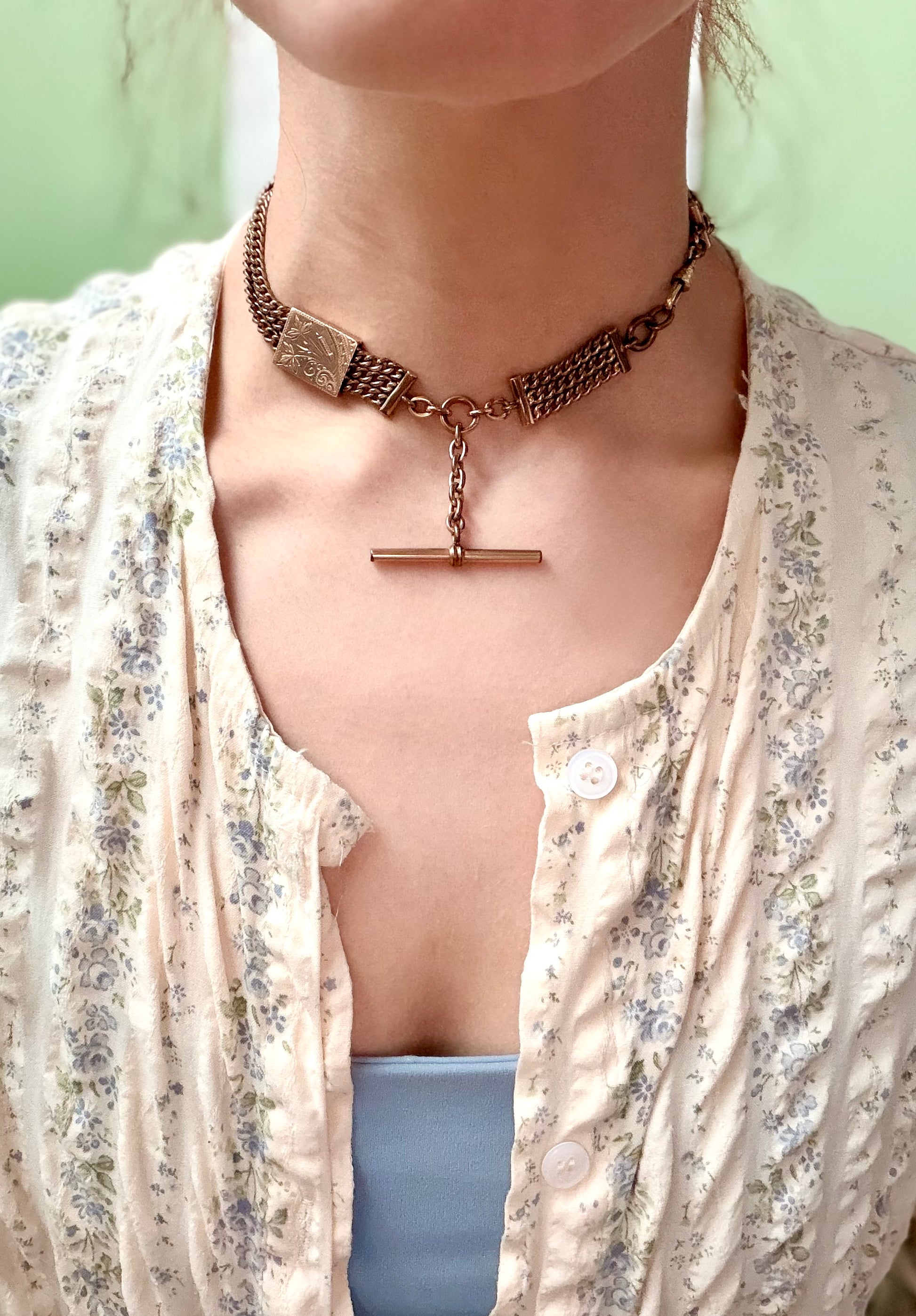 This gilt metal watch chain dates to the late Victorian era, and has a soft rosy gold hue, along with a solid 10 carat gold slide with hand chased floral detailing engraved into it. If measures in total 34cm in length.