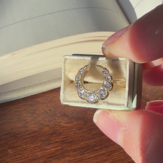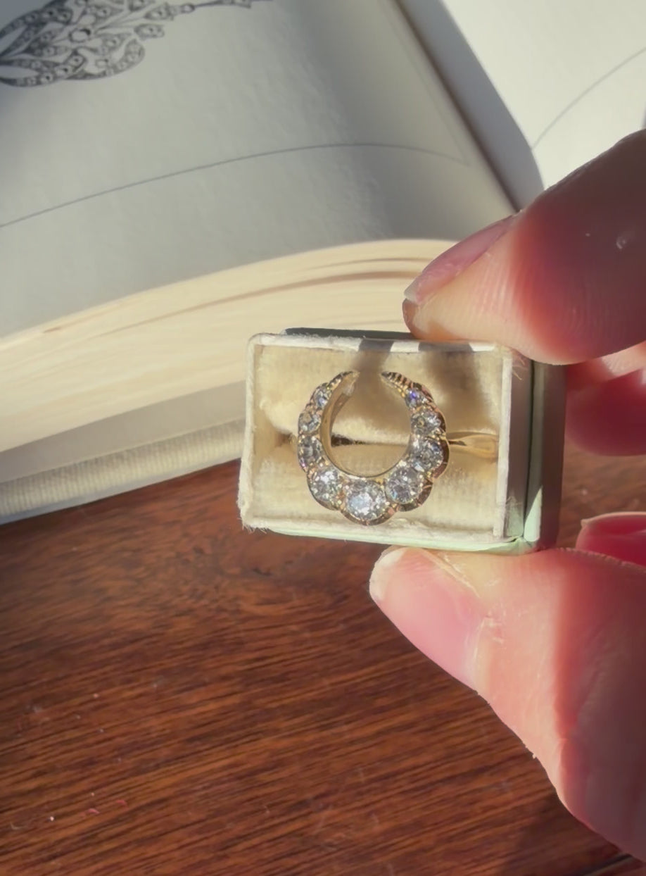 This gorgeous ring likely began life as a stick pin or bar brooch, but now rests on a shank marked as 9 carat gold. There are nine old mine cut diamonds, each side graduating in size toward the center of the crescent, and the diamonds themselves are very bright, lively, sparkly, and dazzles in pretty much every light.