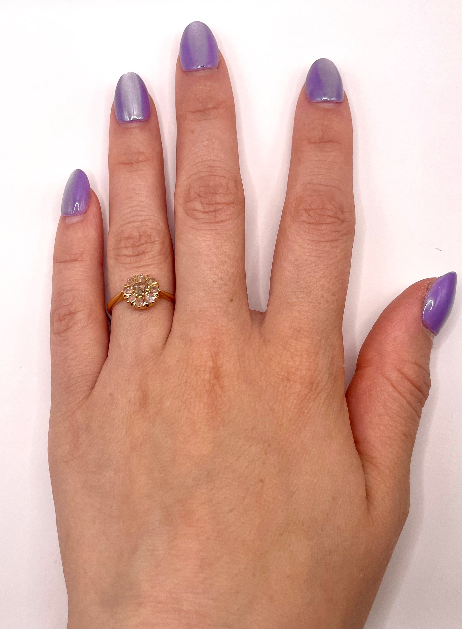 A late 19th century rose cut diamond cluster ring, unmarked, but tests as 18 carat gold. Diamonds have some natural inclusions that are visible without a loupe, but are bright, lively, and attractive. This ring has a sunniness and warmth that reminds me of a sunflower!