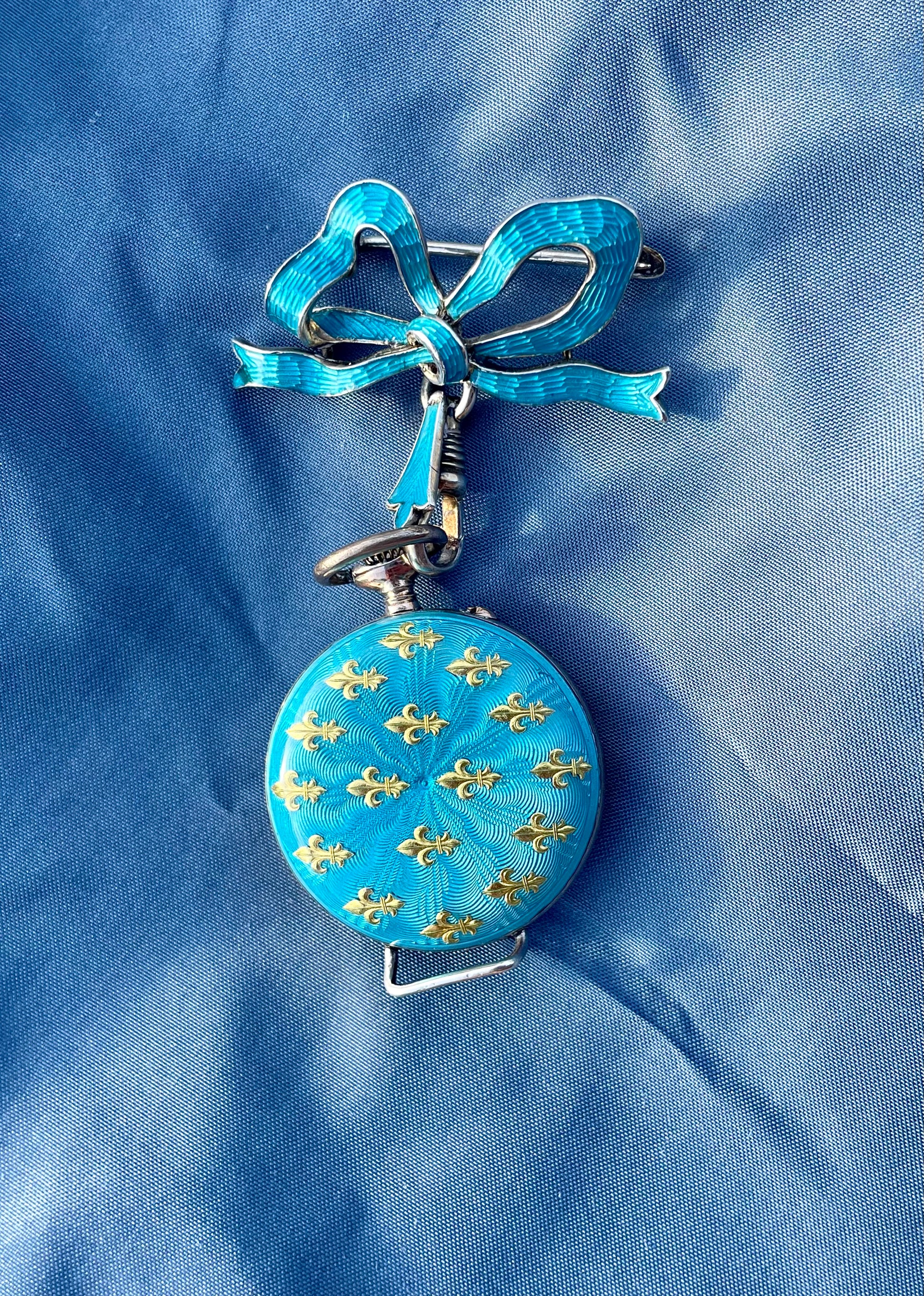 A late 19th century Swiss guilloché enamel “nurse’s” watch and detachable bow brooch pin. The bright blue enamel, with a fleur-de-lis motif, is in fantastic condition, with no major wear or loss, and the delicate hands appear to be securely set in place.