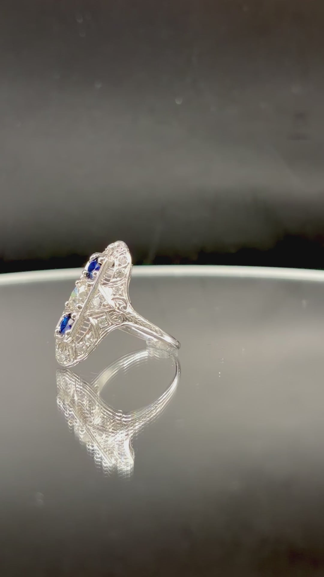 This incredible 1920s Art Deco shield ring is made of bright, gleaming platinum, and at the center of it sits a .80 Old European Cut diamond (color H - I; clarity SI). Above and below it are two exquisitely hued rich, natural sapphires, together weighing a total of about 1.20 carats. To the left and right of the central diamond sits two smaller ones, and beyond those rests an intricate platinum shield set with a halo of diamonds that all add up to a total of an additional .50 carats. If you flip to the definition of the word “statement piece,” this is what you’ll find a picture of.
