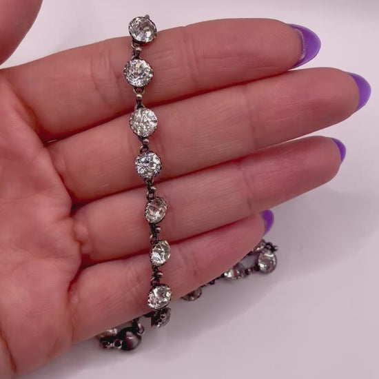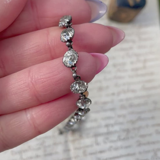 A Victorian paste rivière in fantastic condition, with absolutely stunning sparkle and beautifully and skillfully cut paste stones. The necklace is short at 38cm in length, including the bolt ring clasp components at each end.