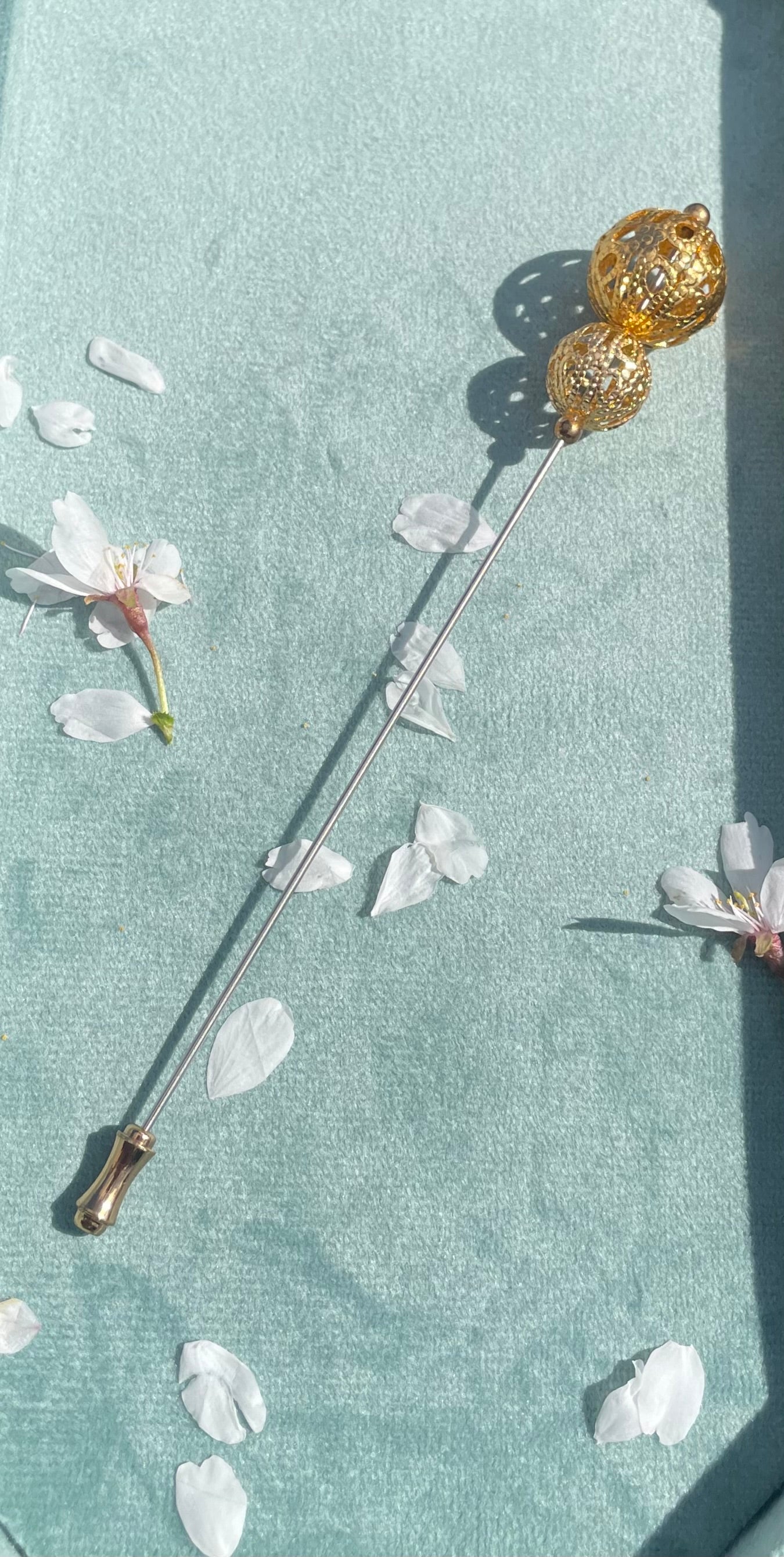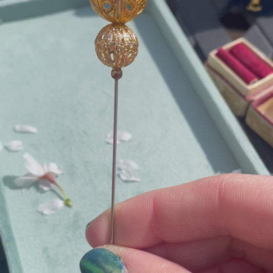 A yellow metal stick pin with its safety catch, this pin has a beautiful design that’s somewhat reminiscent of fine Georgian cannetille work (as Edwardian jewelry, with its affinity for bow designs and clusters, often harkened back to the Georgian era) and can be used to secure large hats, ties, scarves, etc.