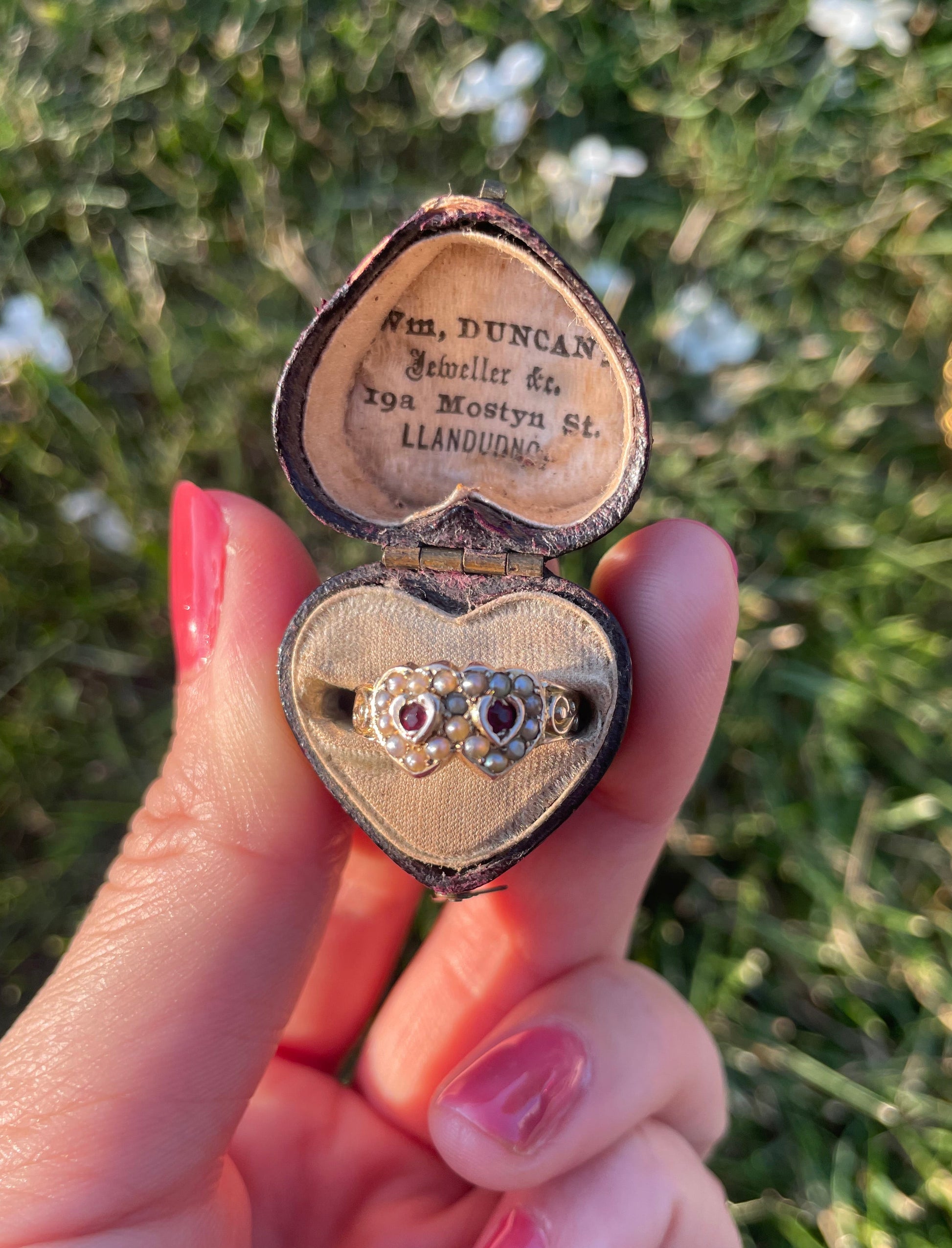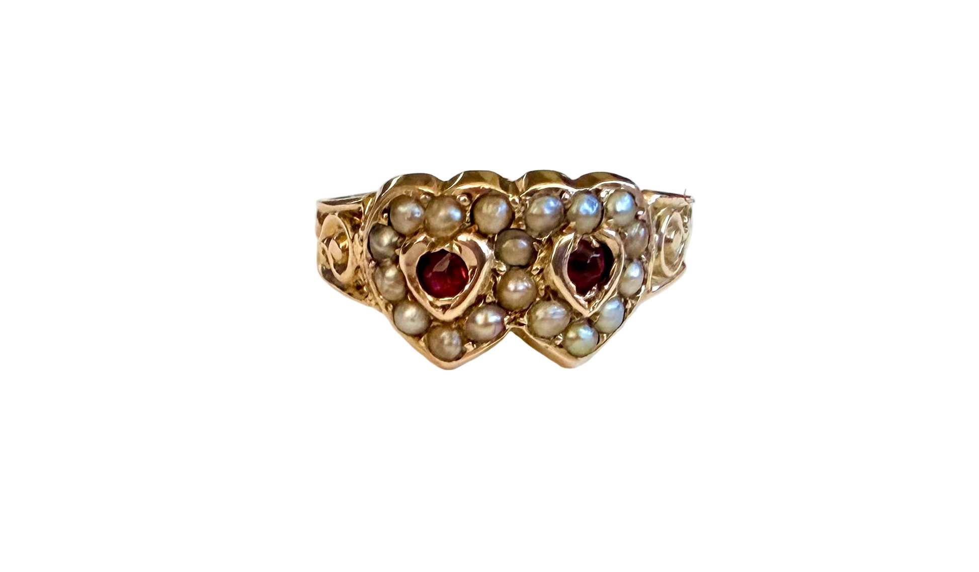 Victorian Garnet & Pearl Double Heart Sweethearts Ring