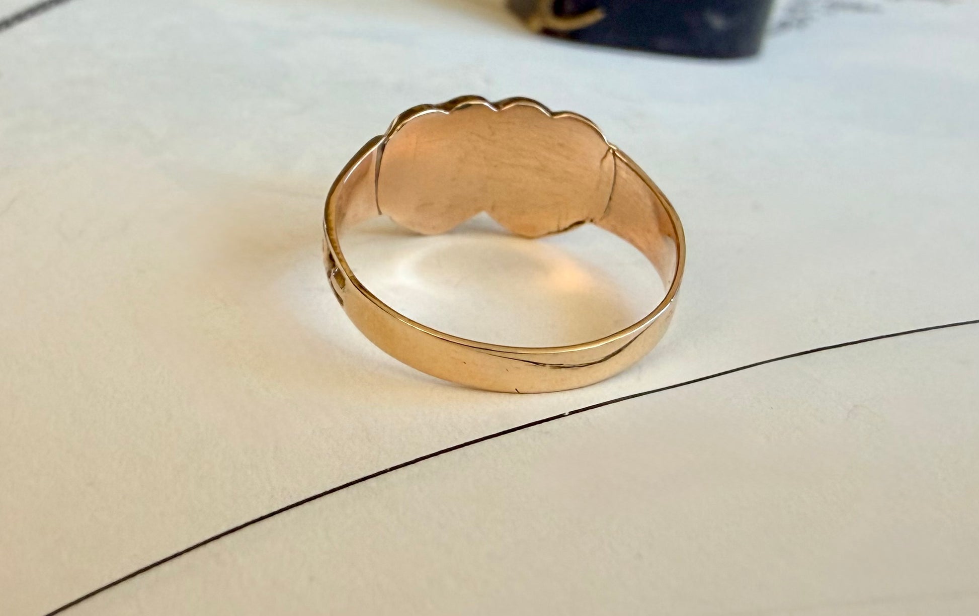 Here is your chance to snag one of the ever-so-sought-after double heart sweethearts ring. Dating to the late Victorian era, the main stones at the center of each heart are set with little garnets of a color that remind me of berry jam. When I first received this ring, the shank was weak, worn, cracked, and almost immediately snapped. Originally crafted in 9 carat gold, it has since been skillfully repaired with 14 carat gold, but in a way that the integrity of the initial scroll design on the shoulders has not been affected. One seed pearl that was missing has also been replaced.