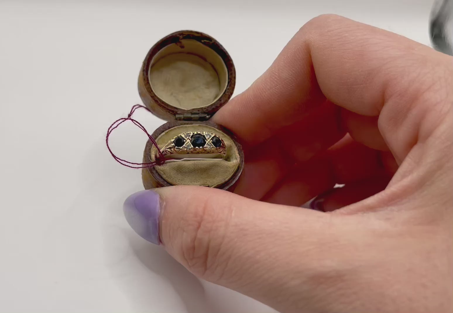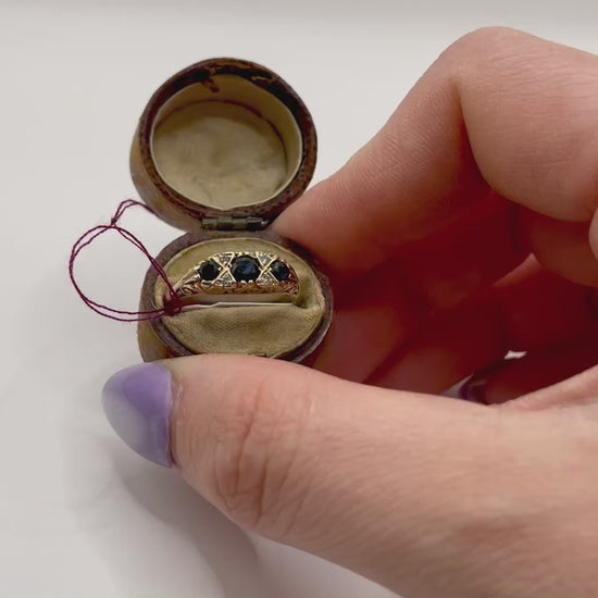 A classic style from the late Victorian era, this ring features three deep-toned graduated sapphires with a total of four diamond spacers in between set in 9 carat gold