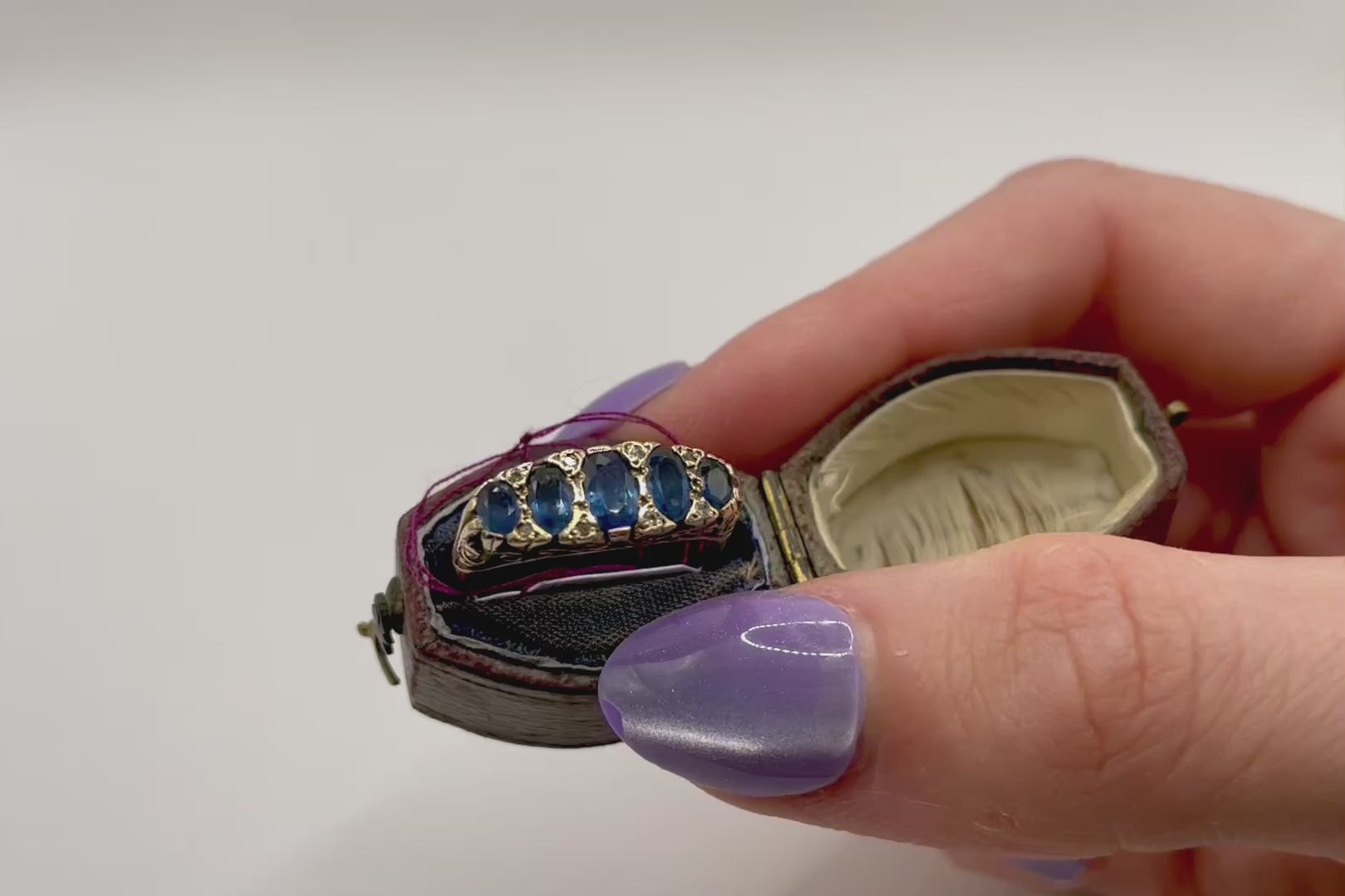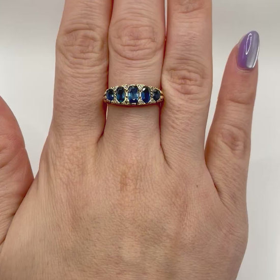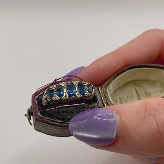Five graduated oval sapphires that shimmer a bright marine blue sit in a chunky 9 carat gold scroll gallery setting separated by diamond spacers.